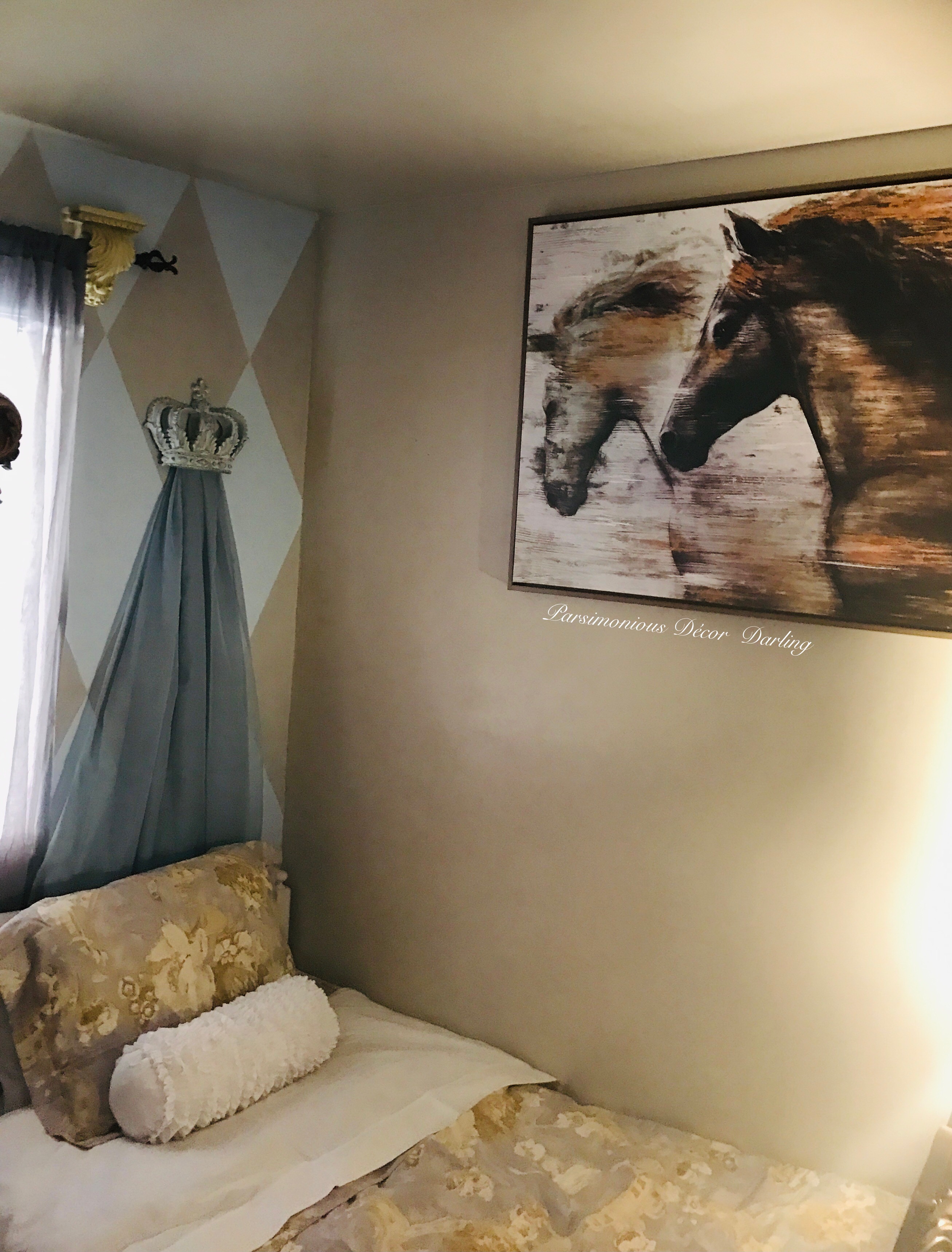 Next, I chose a color palette more complimentary to our home. I chose soft blues and greys. I decided to paint an accent wall in a harlequin pattern to add back a bit of a whimsical aspect.